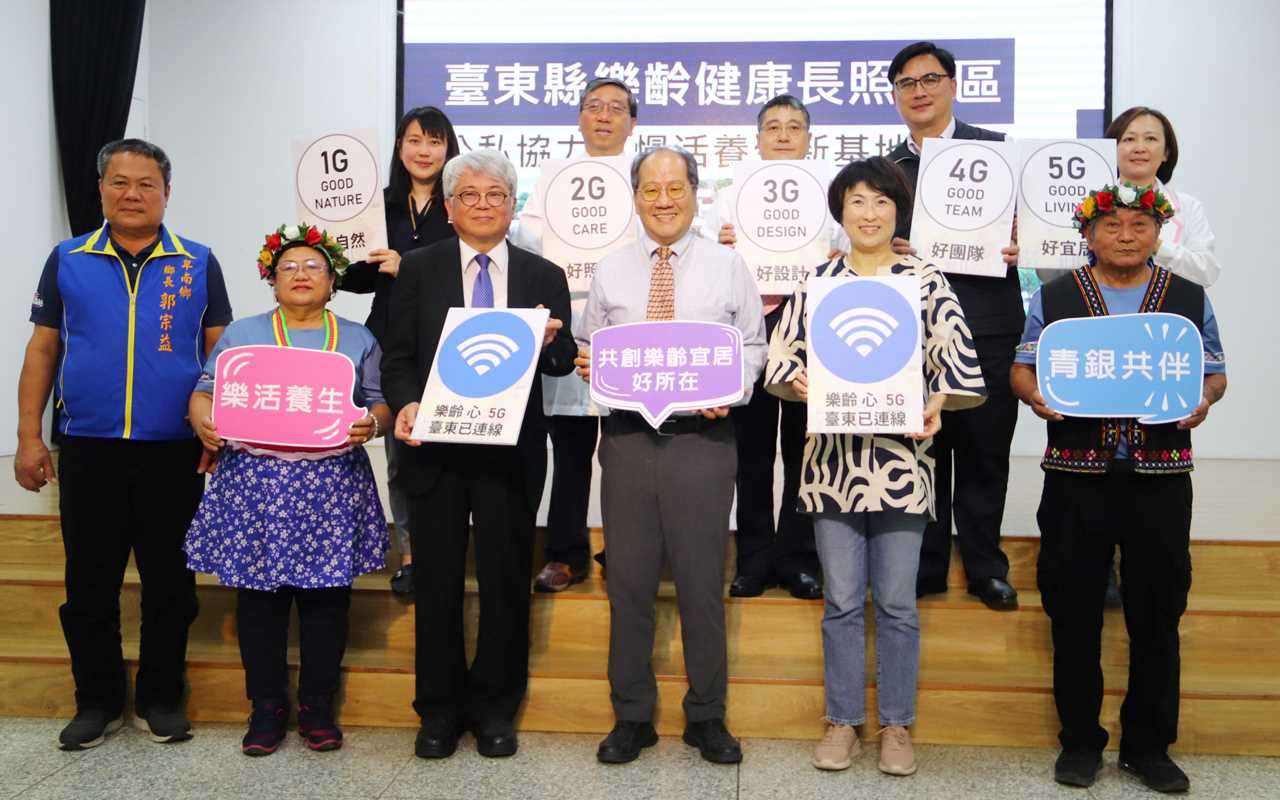 與會來賓持手拿板合影,象徵著臺東縣樂齡健康長照園區在好自然、好照護、好設計、好團隊、好宜居的「樂齡心5G」下,共創樂齡宜居好所在。(第一排左起)卑南鄉長郭宗益、泰安文化健康站長輩范金梅、國有財產署署長曾國基、東基醫療財團法人執行長呂信雄、台東縣長饒慶鈴、泰安文化健康站長輩黃貞,(第二排左起)開新工程顧問公司經理李佩芸、台東基督教醫院院長馬堅毅醫師、潘冀聯合建築師事務所主持人暨副總黃種財、一粒麥子基金會台東服務中心主任潘政憲、迦南銀髮生活福祉中心主任江姿儀。