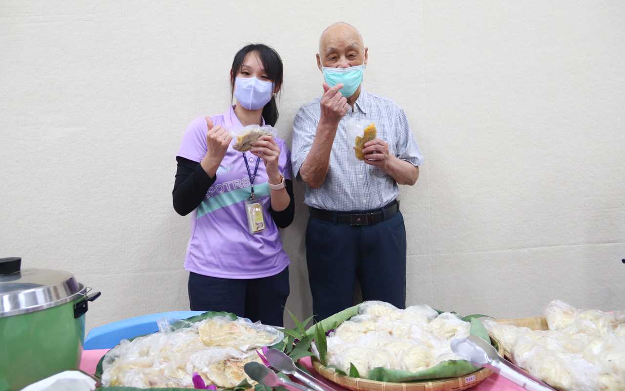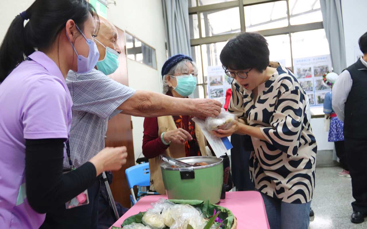 迦南護理之家九十六歲趙伯伯(左二)特地將親手製作的蔥油餅、茶葉蛋分享予台東縣長饒慶鈴(右一)。