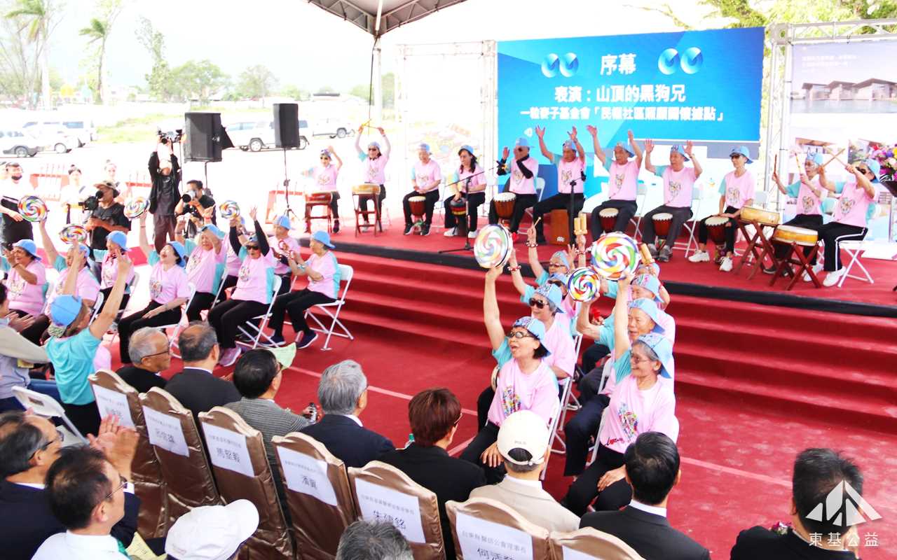 動土感恩典禮在一粒麥子基金會民權社區照顧關懷據點長輩們熱情樂器表演中揭開序幕,長輩穿戴自己彩繪的上衣、帽子,以非洲鼓、平太鼓、木鳥、手搖鈴等樂器,演出經典名曲「山頂的黑狗兄」,展現平日預防及延緩老化課程成果。由東基公益代表醫療、長照、社福服務的同工組成的詩班,也以詩歌「新的異象,新的方向」,傳達一起做新事之心。